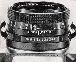 Set the desired diaphragm number on diaphragm ring (15) of the lens opposite to the mark on the lens mount. When lenses with automatic pressure diaphragm (ADB) are used, the diaphragm remains fully open and closes to the set value only when the shutter release is pressed. As soon as the shutter has finished running down, the diaphragm opens again.